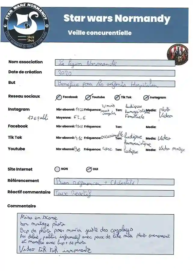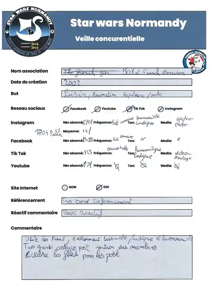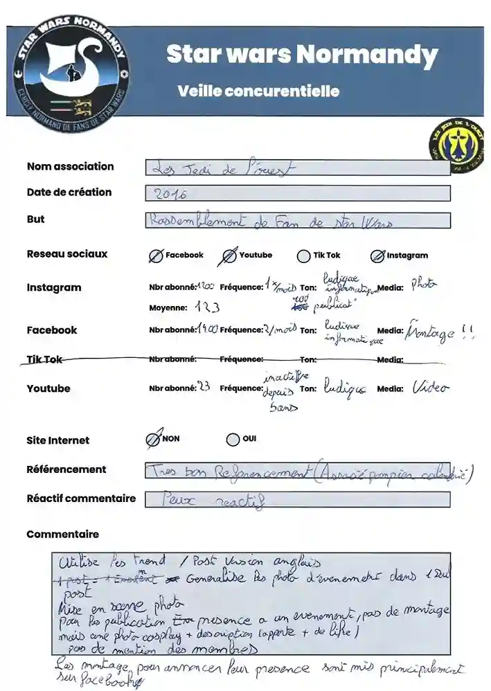 Dans une démarche marketing, j’ai réalisé une veille concurrentielle sur les méthodes de communication des différentes associations Star Wars en France. Cette analyse m’a permis d’identifier les stratégies utilisées et de déterminer lesquelles étaient les plus efficaces.